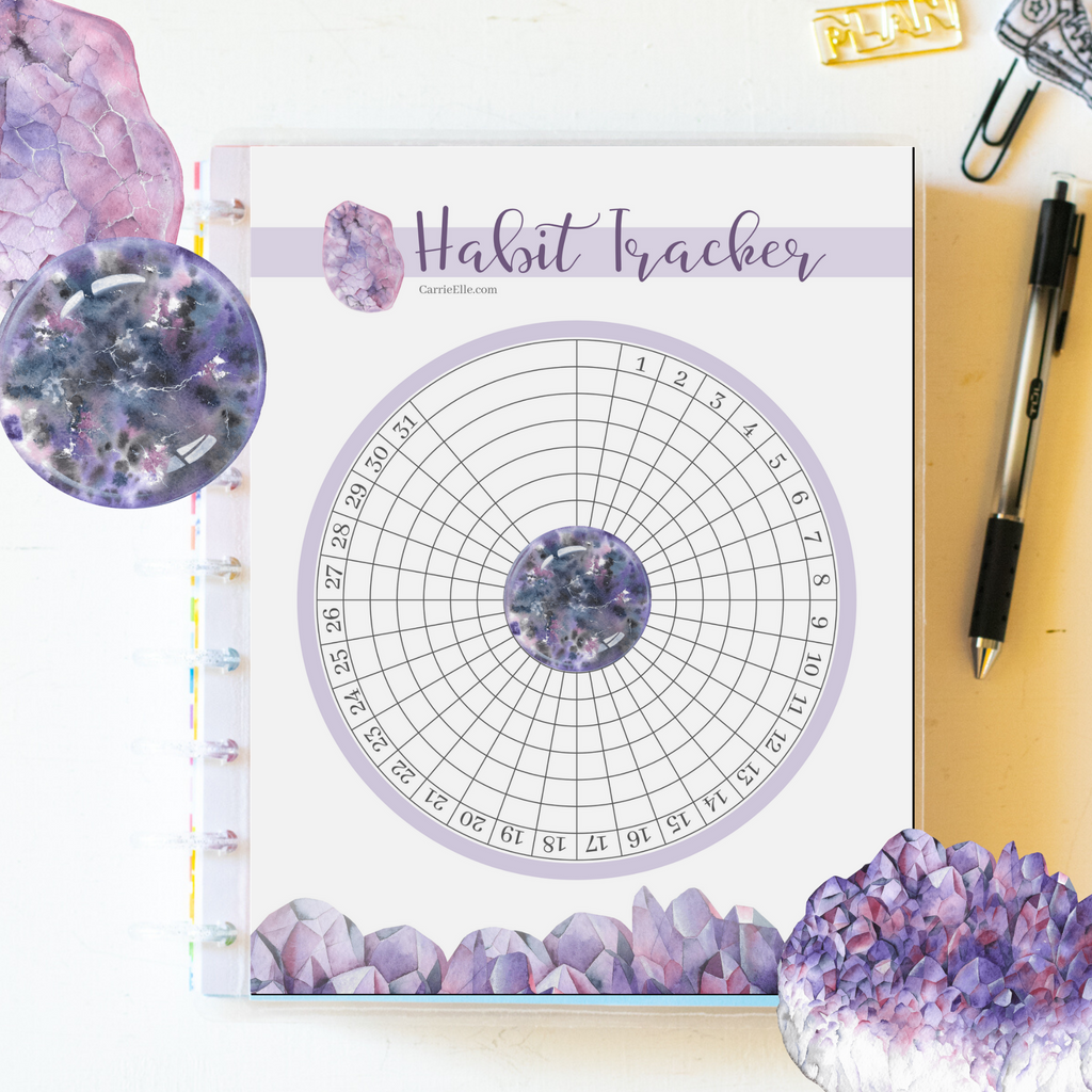 This printable circular monthly habit tracker for your Happy Planner will keep you on-track! It's perfect for your Happy Planner, and it's got a gorgeous purple crystal and amethyst theme.